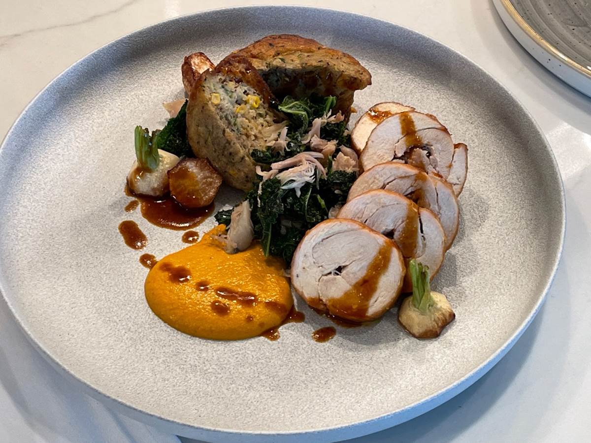 Roulade of chicken comes with braised kale, corn cake, romesco sauce, and roasted turnips.