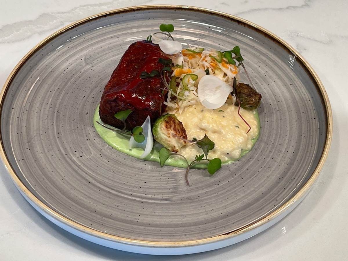 Guava barbecued short ribs come with cheddar grits, roasted poblano peppers, and Brussels sprouts.