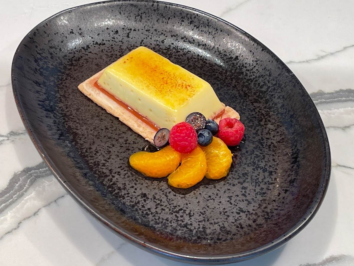 Orange Blossom Flan is Blood Orange Gelée, Orange-scented Shortbread and Orange Blossom Honey-drizzled Fruit.