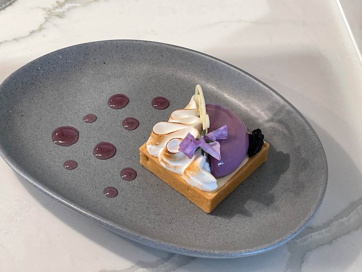 Last but not least, the Blackberry Tartelette includes Lemon Bavarian and Blackberry Mousse enrobed in Glacage with Candied Violet.
