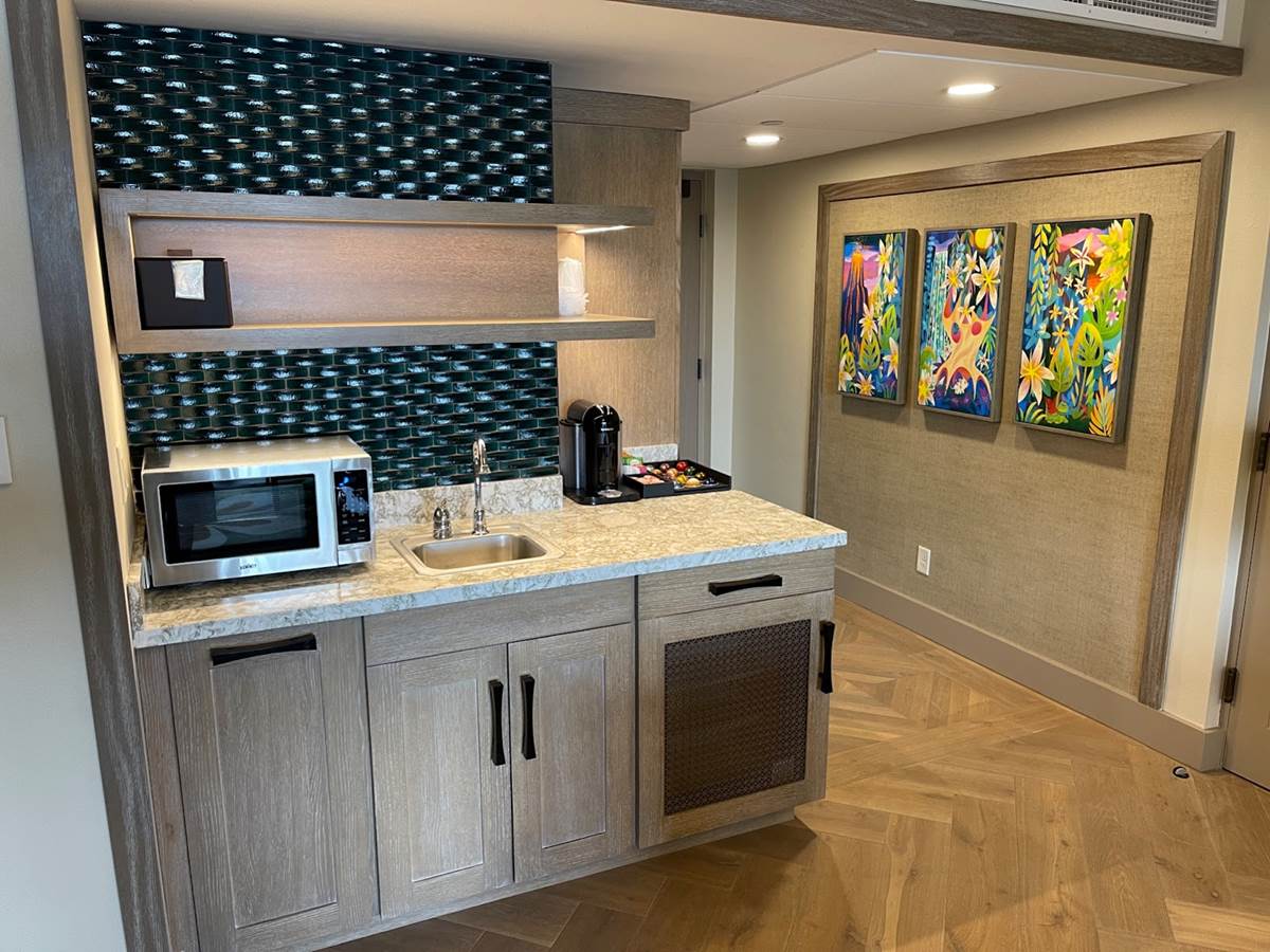 You also get a great kitchen area with a microwave, sink, and coffee machine.