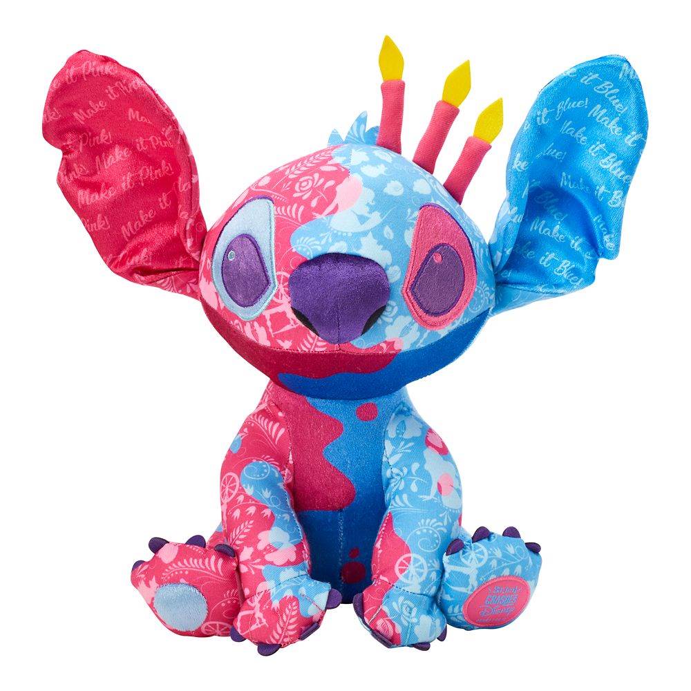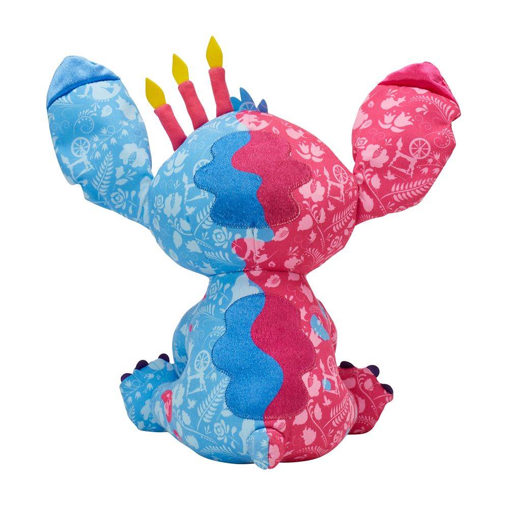 Oh no! Stitch has found himself in quite the mess! Hit on both sides with different magical colors from Flora, Fauna, and Merryweather’s wands, Experiment 626 is now two colors! Scripted on each ear is “make it pink” or “make it blue” and the colorful pattern features icons of the spinning wheel, Aurora, the fairies and more. To complete his look three “lit” candles rest atop the left side of his head.