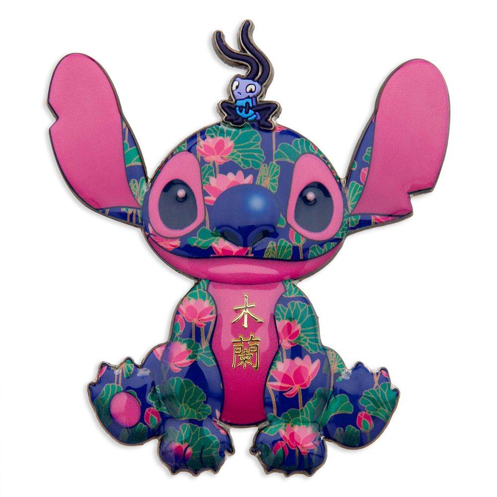 We’ve reached the end of the series and Stitch Crashes Disney finishes strong with a plush and pin inspired by Mulan. Our alien friend is sporting a blue floral pattern with pink color blocking on his ears and chest as well as the Chinese symbols for Mù Lán. Finally, he’s joined by a special pal as the adorable cricket Cri Kee, has come to rest upon his head.