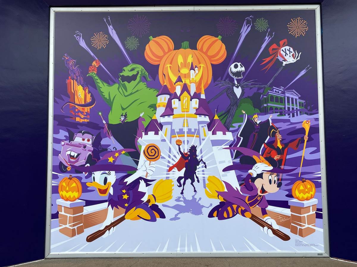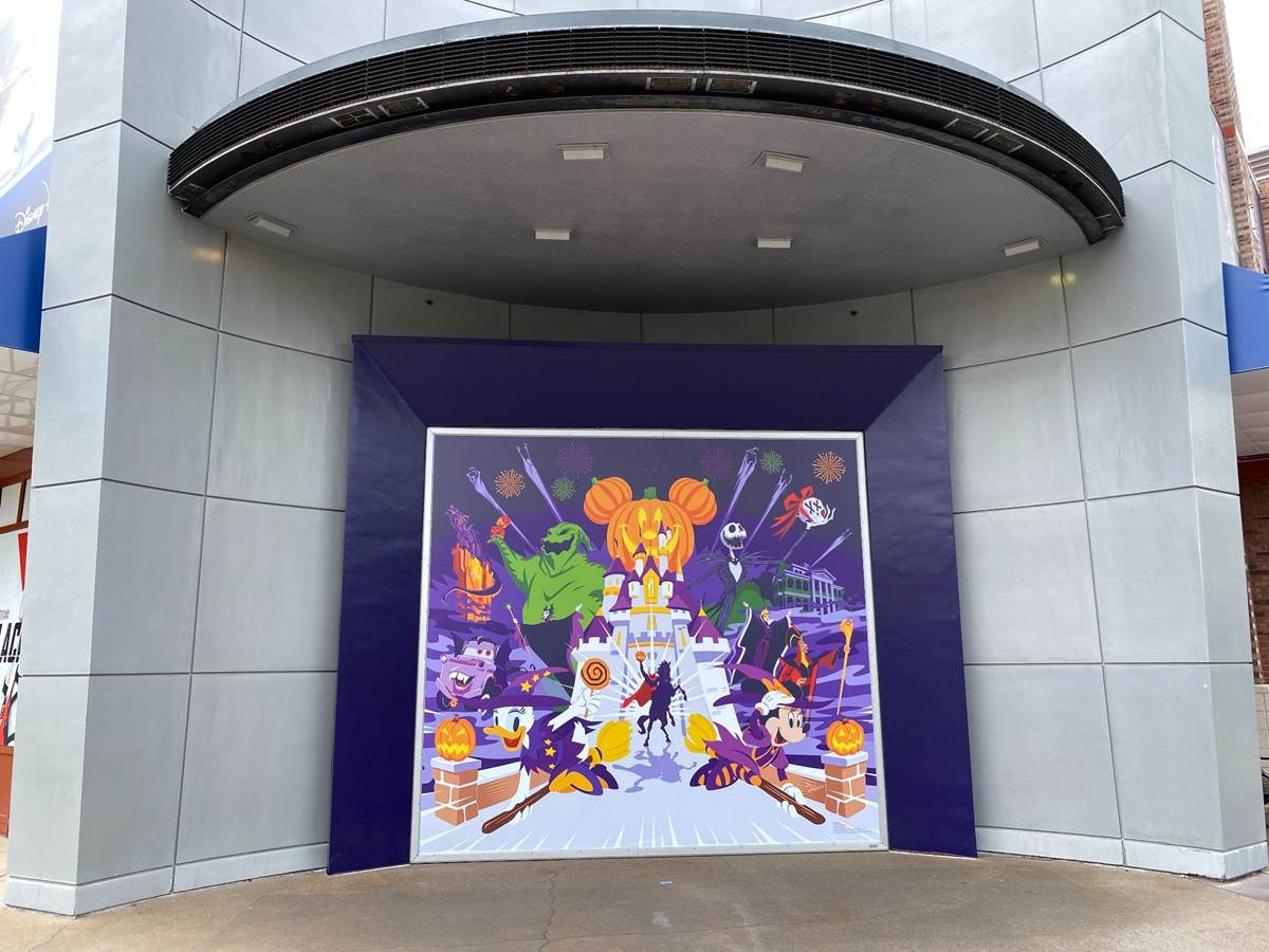 The corner of the former ESPN Zone has been a rotating photo op as of late, recently used to promote Raya and the Last Dragon and Avengers Campus. It’s now a splashy art piece celebrating Halloween Time with Sleeping Beauty Castle at the center. The Town Square giant Mickey pumpkin is looming behind it while the Headless Horseman charges across the drawbridge, with Minnie Mouse and Daisy Duck disguised as witches on brooms leading it towards you. Jack Skellington and Oogie Boogie have broken out of Haunted Mansion Holiday and the Tivan Gallery has been taken over by Guardians of the Galaxy – Monsters After Dark. The Cars Land gang is out for some trick-or-treating while the Disney Villains lurk around corners.