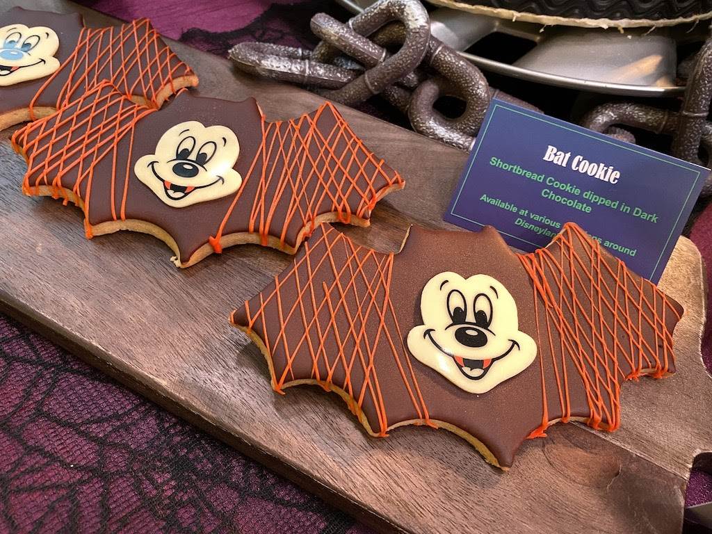 - Bat Cookie – Shortbread bat cookie dipped in dark chocolate with a Vampire Mickey face