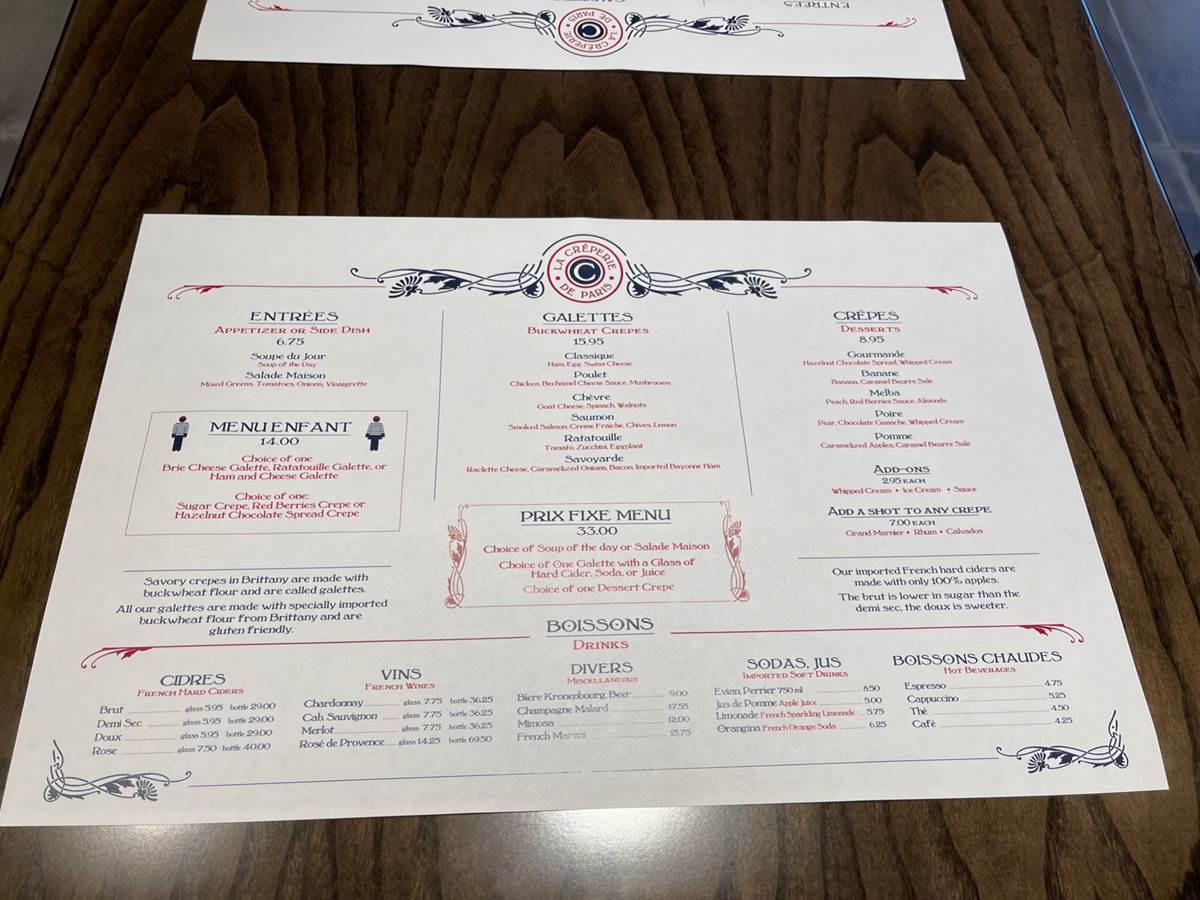 - Guests who want it all can get the daily prix fixe menu which will include a choice of soup or a salad, one savory galette, one dessert crêpe, and a glass of hard cider, soda, or juice.