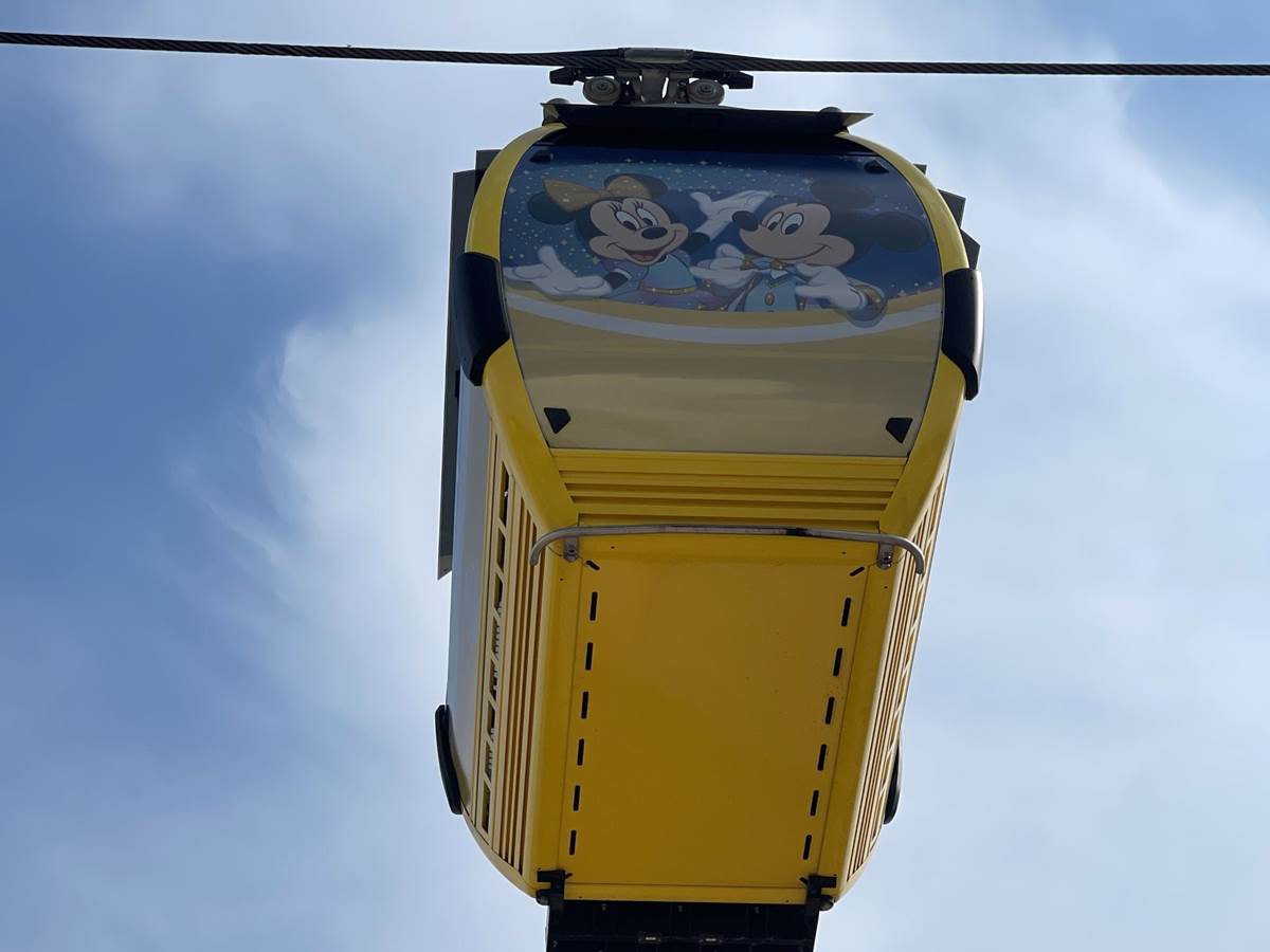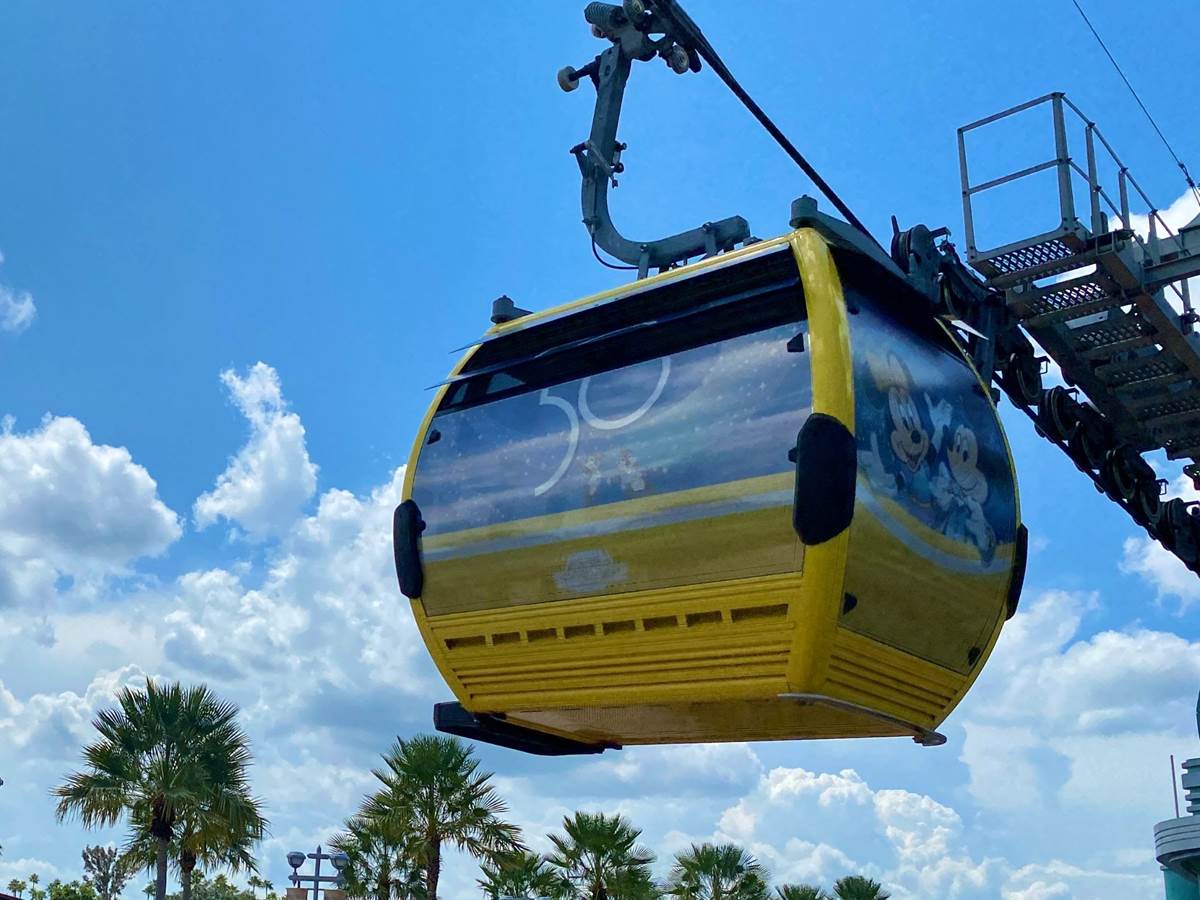 And it’s not just the ground transportation that’s getting in on the anniversary fun. We also saw a special wrap on one of the gondolas from the Disney Skyliner. Mickey and Minnie can also be seen on the gondola wrap, once again joined by Chip and Dale. A 50th logo and “World’s Most Magical Celebration” also adorn two of the windows. So now you can cruise the skies of Walt Disney World while also celebrating the upcoming 50th anniversary.
