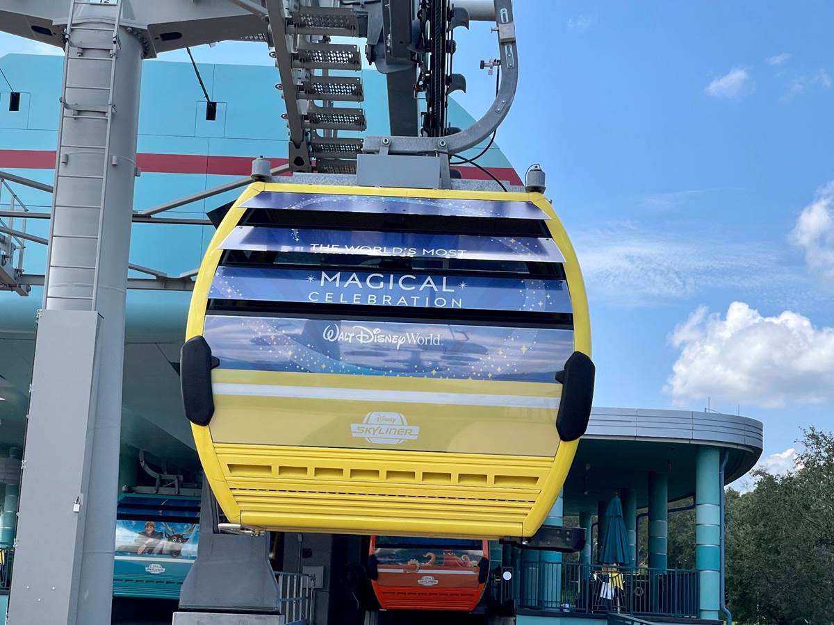With the “World’s Most Magical Celebration” less than a month away, more and more changes keep popping up around Walt Disney World. Today, we spotted some special wraps on a Walt Disney World bus and one of the Disney Skyliner gondolas.