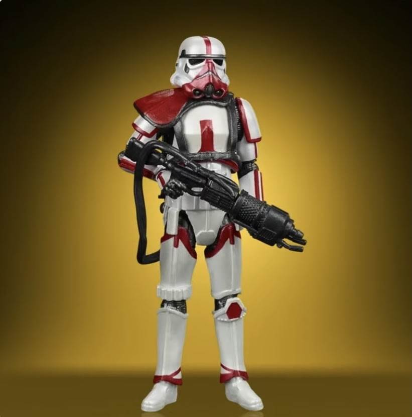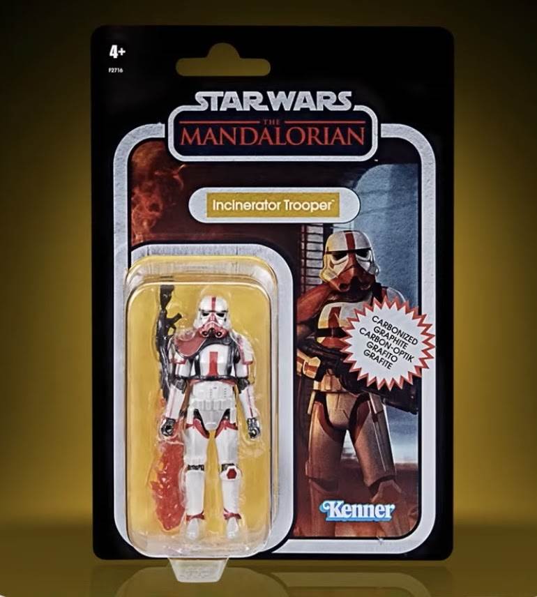 The next series features characters from The Mandalorian, in the new Hasbro Vintage Series carbonized collection. Characters that will be seen are, of course, The Mandalorian, Moff Gideon, The Armorer, a ShoreTrooper, and an Incinerator Trooper.