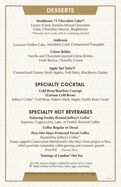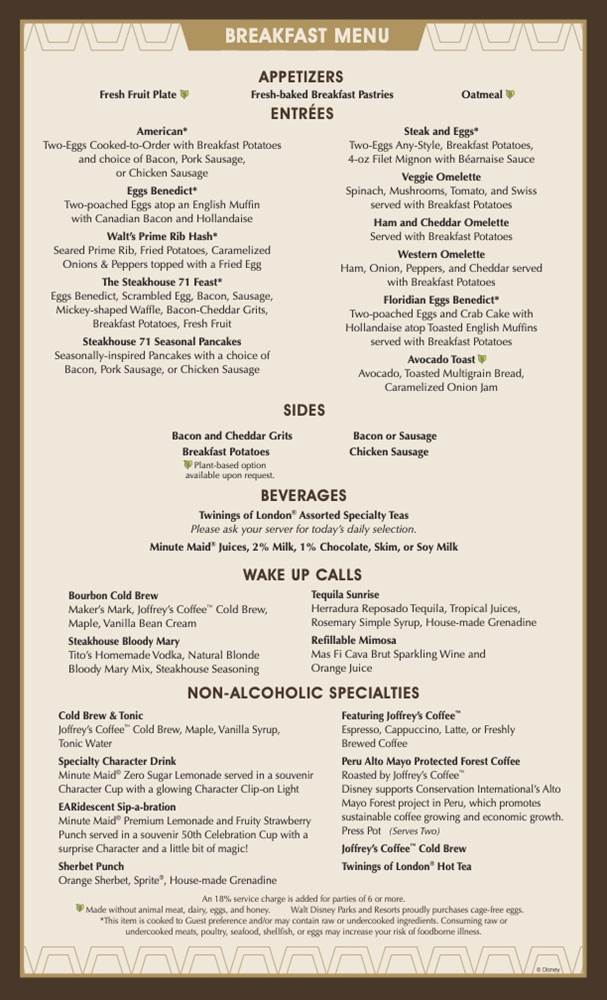 - Guests can start their day with a delicious breakfast at Steakhouse 71 with a menu that offers everything from Fresh-baked Pastries and Avocado Toast to Walt’s Prime Rib Hash and Eggs Benedict! The Steakhouse Bloody Mary and the Bourbon Cold Brew (Joffrey’s Coffee Cold Brew, bourbon, maple, vanilla bean cream), as well as espresso, cappuccino, latte, freshly brewed coffee, assorted teas, and juices are offered to help guests get up and moving for the day.