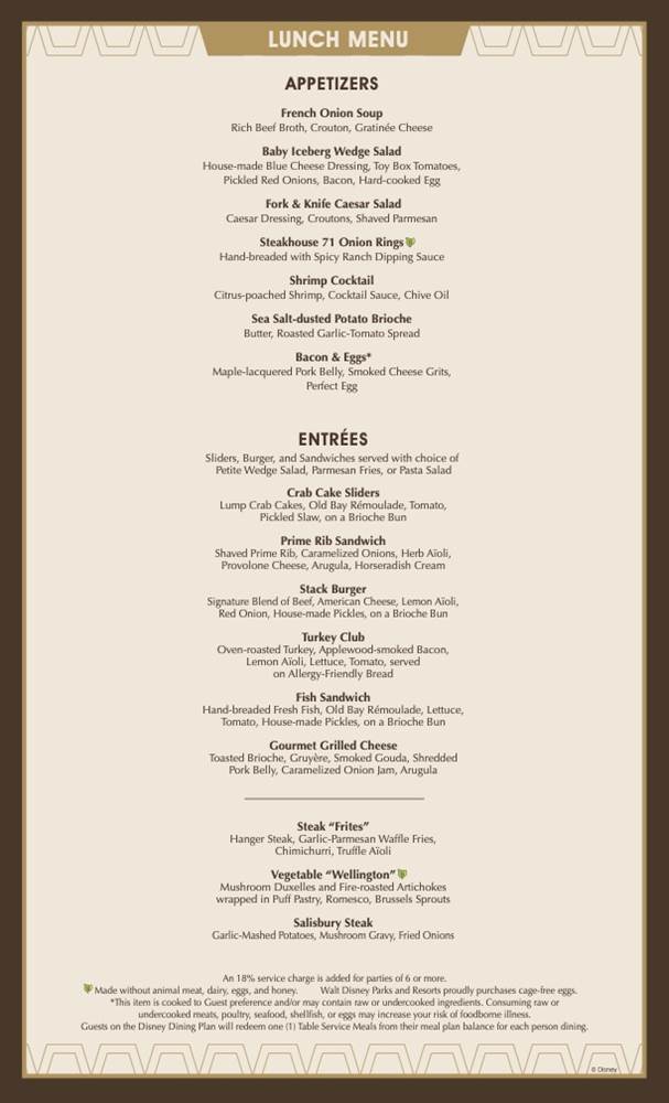 - Steakhouse 71, located on the first floor of Disney’s Contemporary Resort, will open its doors on October 1st for breakfast, lunch, and dinner, and Disney has given us a sneak peek at the look of the restaurant, as well as the meny which is sure to become a fan-favorite.