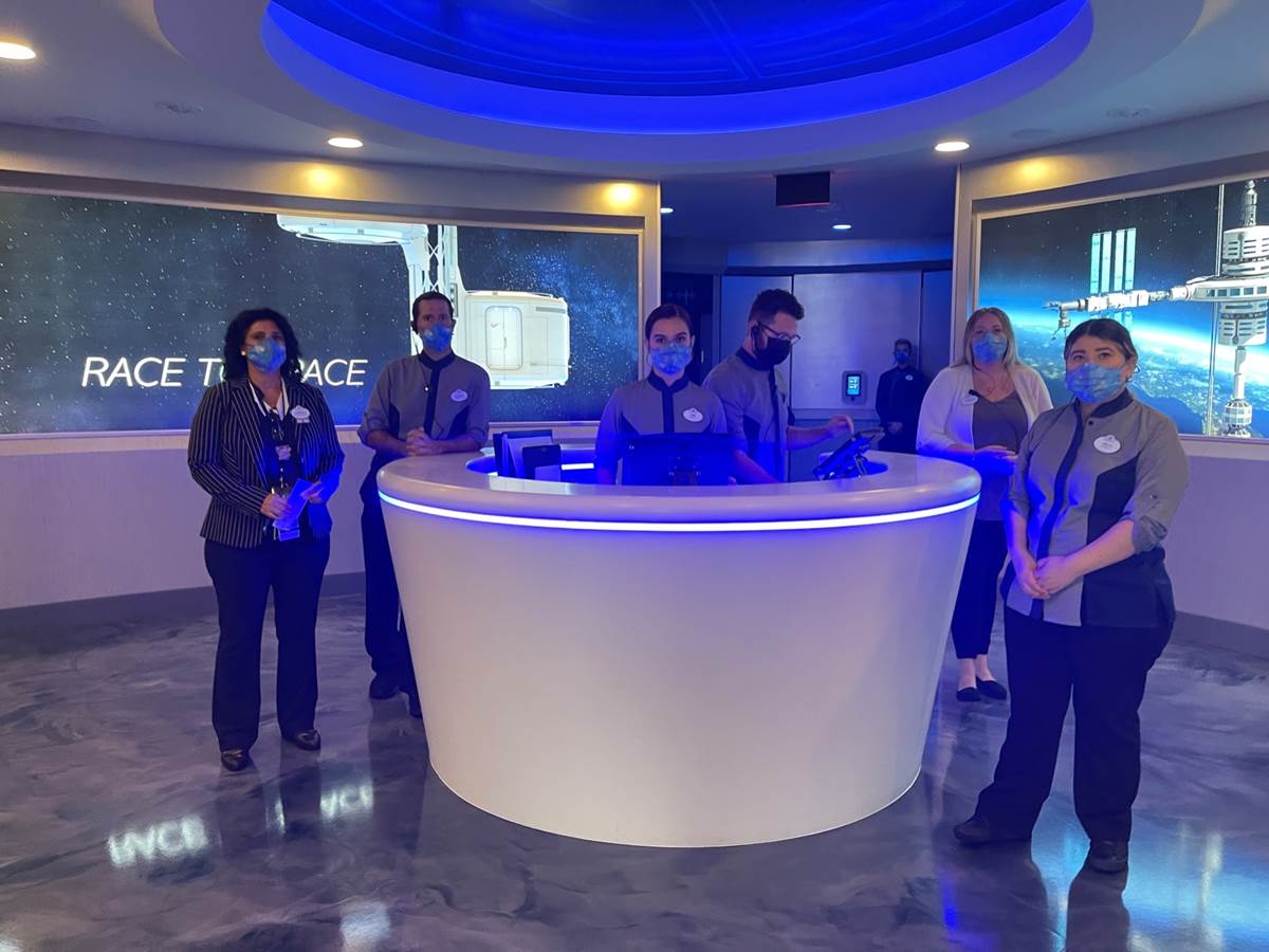 The restaurant is located to the right of the entrance to Mission: SPACE, with the check in counter located before entering.