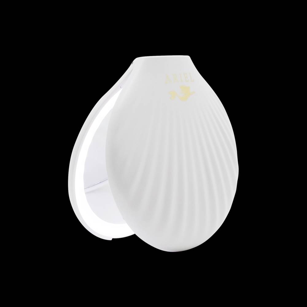 - A seashell shaped compact mirror equipped with a 2x magnified top mirror.