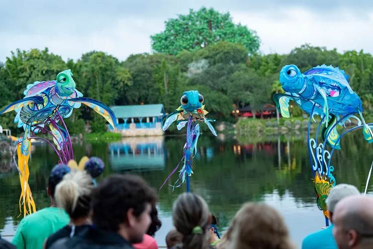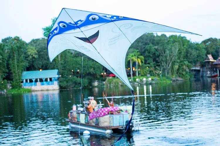 Happening several times daily at the Discovery River Theater near DinoLand U.S.A. (former home of Rivers of Light), guests make their way into the space, joined by a team of performers bringing with them a colorful collection of oversized props and kites adorned with Disney animal friends from The Little Mermaid, A Bug’s Life, and Finding Nemo. Original, worldbeat arrangements of favorite Disney tunes fill the air, and the excitement builds toward the launch of an impressive show of kites over the lagoon.