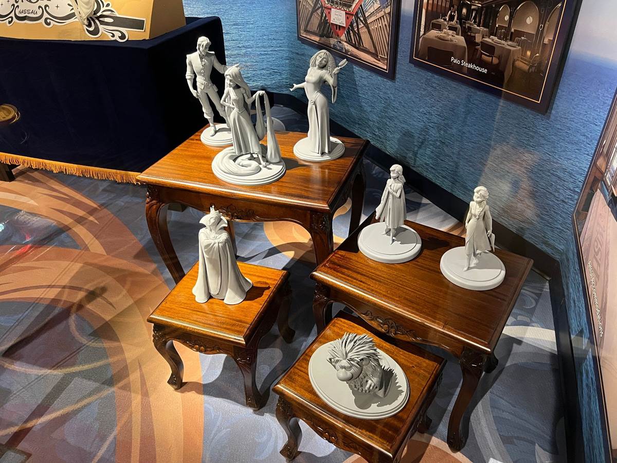 - The back wall of the display features photos of various offerings found on the currently operating Disney Cruise Line ships, in addition to concept art for Disney Wish exclusive offerings.