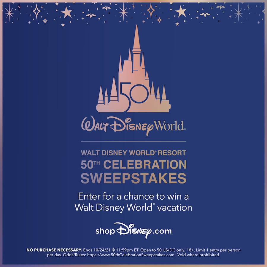 - Now through October 24, 2021, you can enter the Walt Disney World Resort 50th Celebration Sweepstakes for a chance to win a five-day/four-night vacation to the Walt Disney World Resort for you and up to three guests!