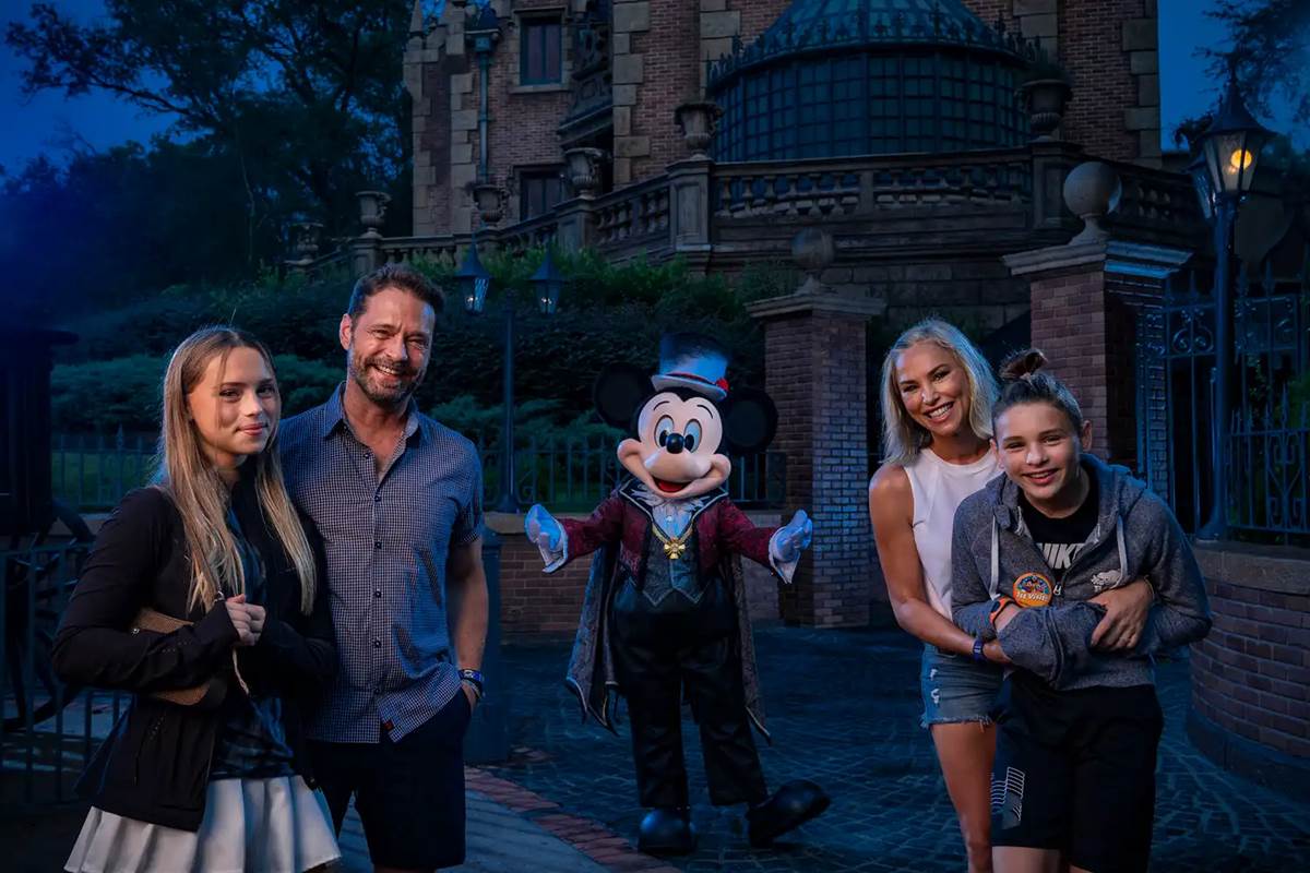 - Priestley, his wife and kids posed for a spooky photo with Mickey Mouse in front of The Haunted Mansion.