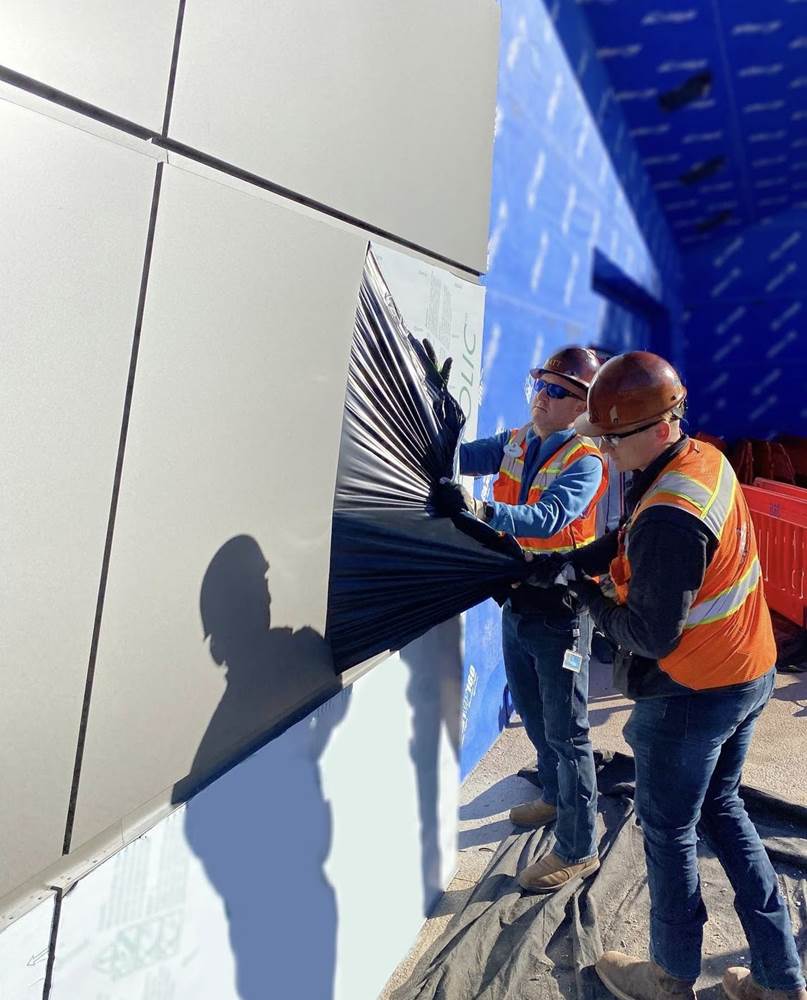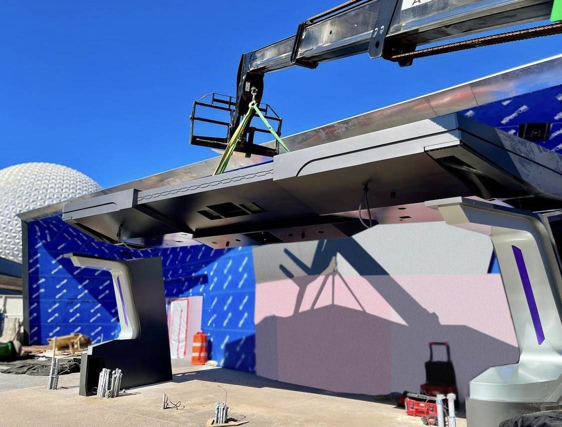 “This morning we unwrapped the metal panels that will cover the entire front surface of the pavilion. These metallic silver panels bring a sleek, intergalactic aesthetic that fits perfectly in our World Discovery neighborhood.