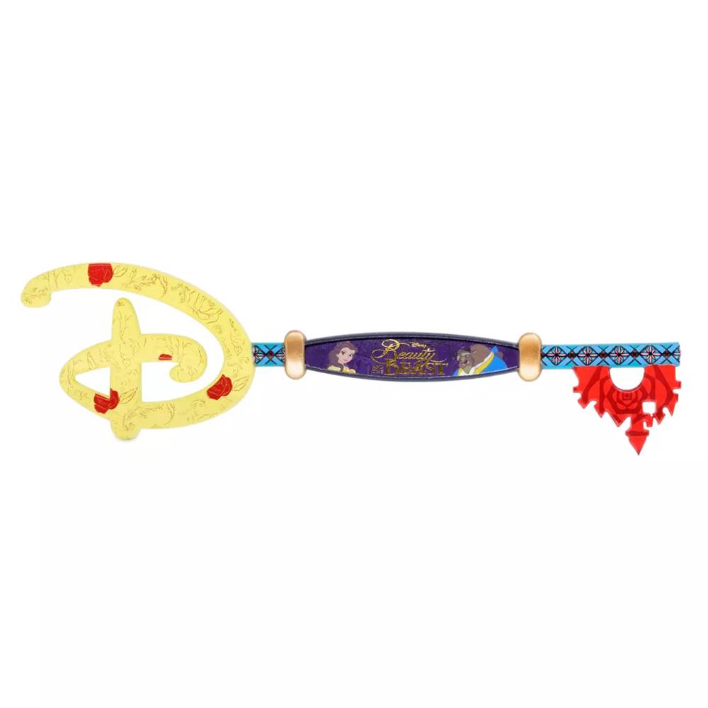 - The back end of the Key is decorated in yellow with an Enchanted Rose filigree while the center Belle and Beast with the film’s logo.