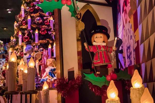 - In the holiday form of the attraction, guests can set sail along a wondrous wintry waterway transformed with whimsical décor and behold jubilant regional adornments all along a world tour of good cheer. The classic costumed chorus of children sings the classic anthem, “It’s a Small World (After All)” as well as a blend of traditional holiday tunes, and guests can even listen to the South Sea mermaids who sing “Jingle Shells” and leave a plate of fish for Santa.