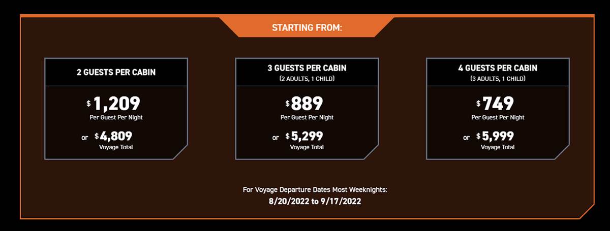 - Pricing breaks down depending on how many guests are in each cabin. You can have either 2, 3 or 4 guests per cabin.
