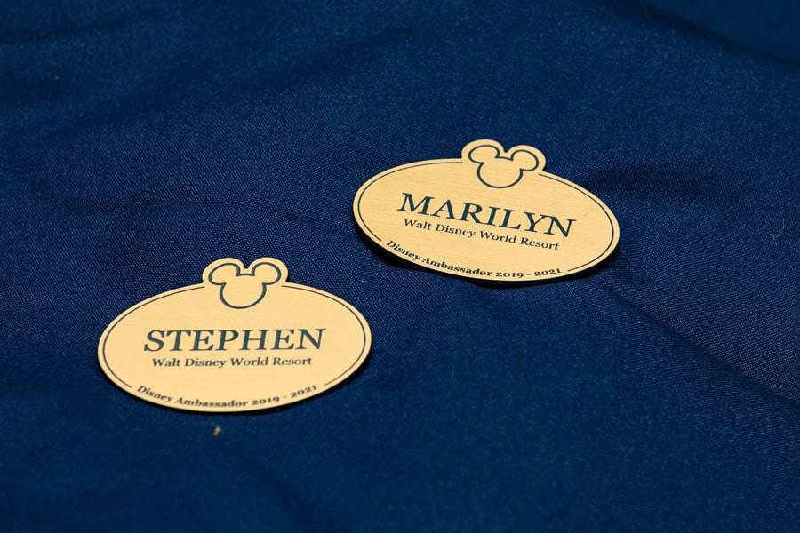 - The new name tag is a vibrant gold, a reference to the pin the Ambassadors wear during their time as Ambassadors. The shape of the name tag and blue coloring was inspired and taken from Walt Disney’s Disneyland employee badge #1. The badge was worn briefly during Disneyland’s opening day rehearsal in 1955.