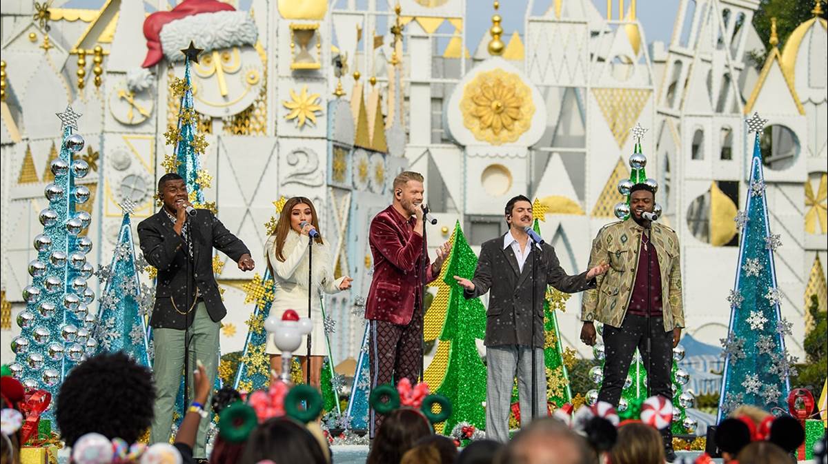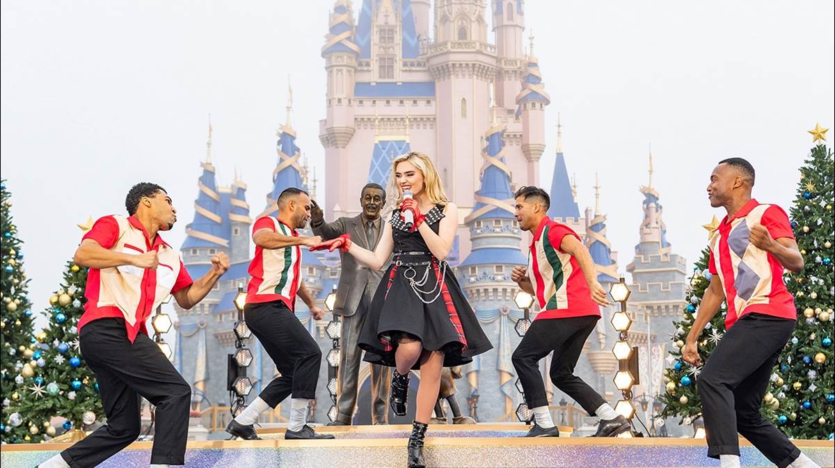 Darren Criss performs “Christmas Dance” off his new holiday album in front of Cinderella Castle.