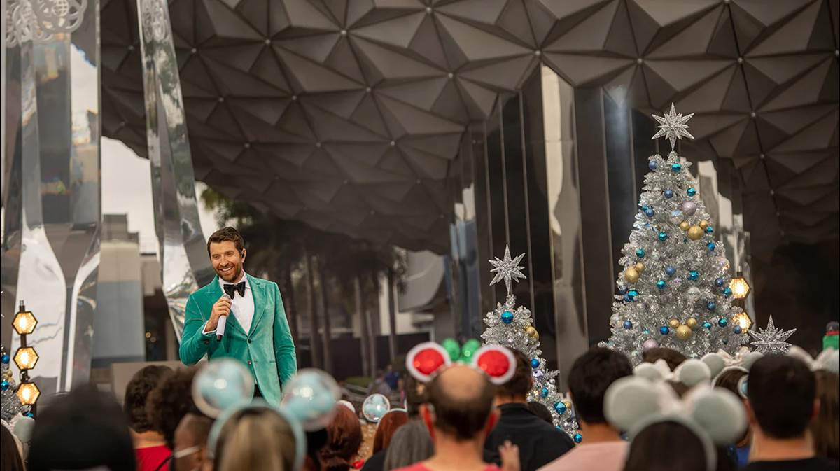 Brett Eldredge performs his rendition of “Rudolph the Red-Nosed Reindeer” in front of Spaceship Earth.