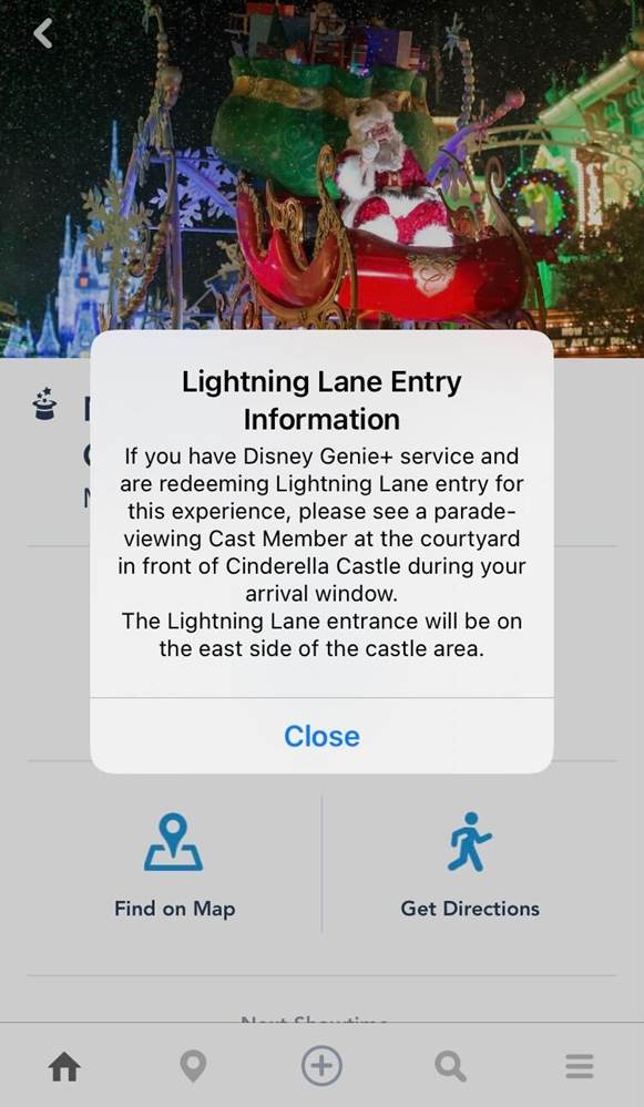 - In the My Disney Experience app when booking a Lightning Lane time for the parade, you receive a notification within the app that reads: