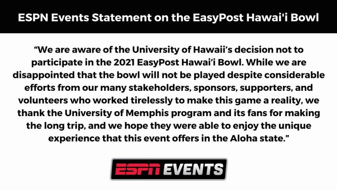 - UH Mānoa Athletics Director David Matlin: “The health and safety of our student-athletes is the most important part of this decision. The recent surge in COVID-19 cases has forced us to not participate in the game. We are disappointed for our players, coaches and fans. ESPN and the EasyPost Hawaiʻi Bowl staff did everything they could for us and we appreciate their valiant effort throughout the week. We want to thank the Memphis Tigers for making the long trip to Hawaiʻi. We are disappointed we can’t compete on the football field.”
