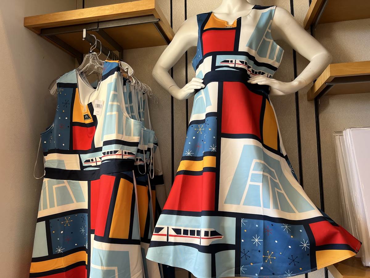 A festive dress is available at this location, keeping a retro-modern aesthetic featuring bright colors and iconography indicative of the resort. The dress comes in various sizes and sells for $108.00