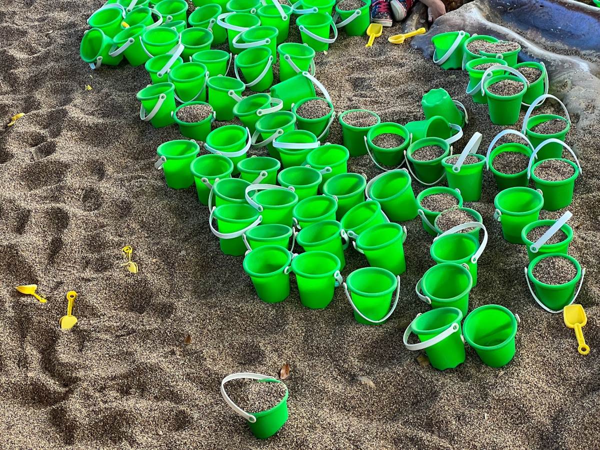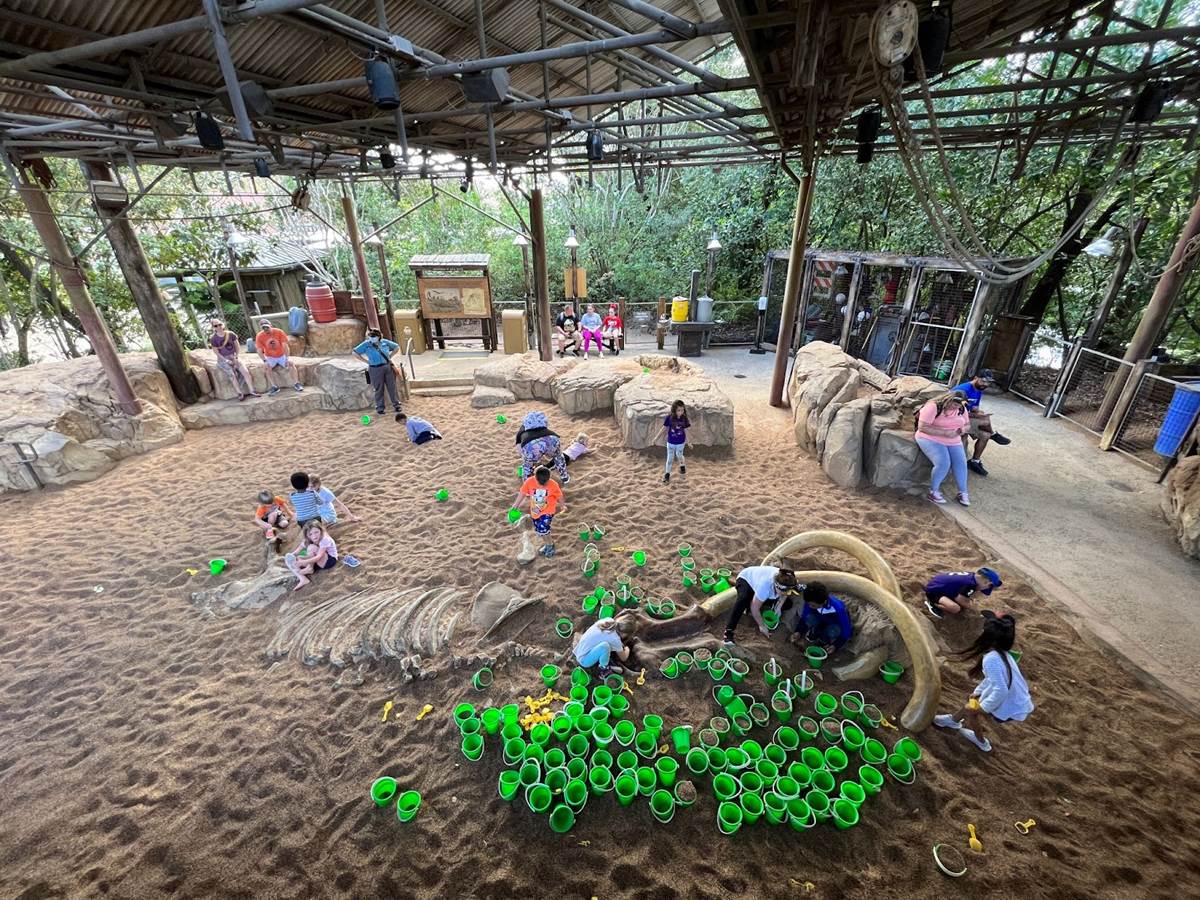 Inside The Boneyard’s fossil pit, plenty of buckets and spades are available to use.
