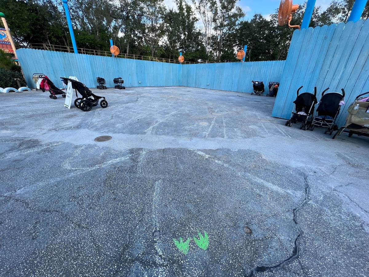 All that is left of the former coaster are these Dinosaur footprints where kids would stand to make sure they were tall enough.
