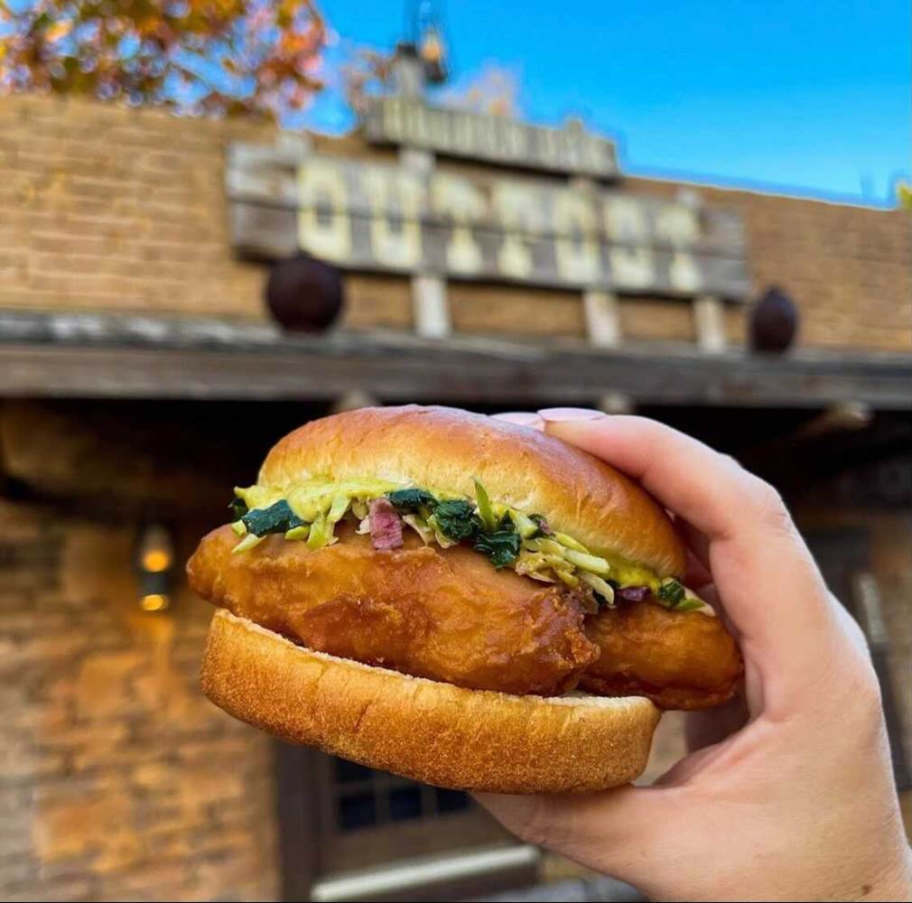 Stroll on back to Frontierland to the Golden Oak Outpost for the Slue Foot Sue Fried Fish Sandwich! The sandwich includes a cilantro lime slaw and poblano mayonnaise for $12.99.