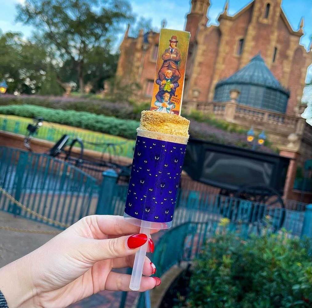 First off, we have the Haunted Mansion inspired Chilling Chamber Push Pop available at Sleepy Hollow Refreshments for $5.49. While there is no description available for what the flavor of this push pop cake is, it appears to be a vanilla cake with vanilla icing and graham cracker crumbs.