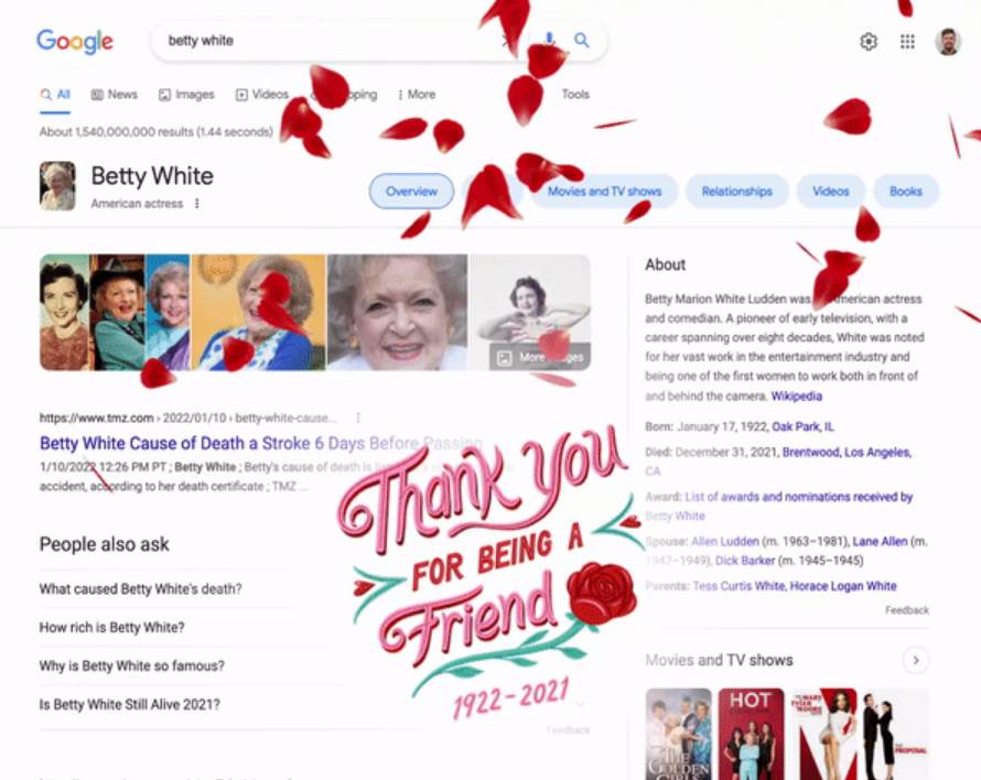 - Below is what the Google search results page will look like when someone searches for “Betty White” on her birthday: