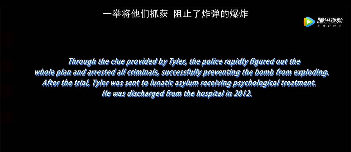 - “Through the clue provided by Tyler, the police rapidly figured out the whole plan and arrested all criminals, successfully preventing the bomb from exploding,” a caption said. “After the trial, Tyler was sent to lunatic asylum receiving psychological treatment. He was discharged from the hospital in 2012.”