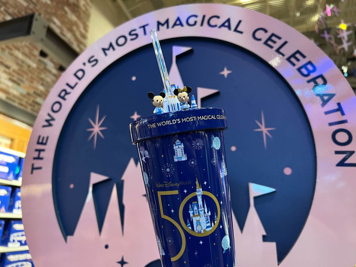 A wonderful new tumbler for the 50th anniversary of Walt Disney World, featuring cute, Mary Blair-esque versions of Mickey and Minnie atop the cup.