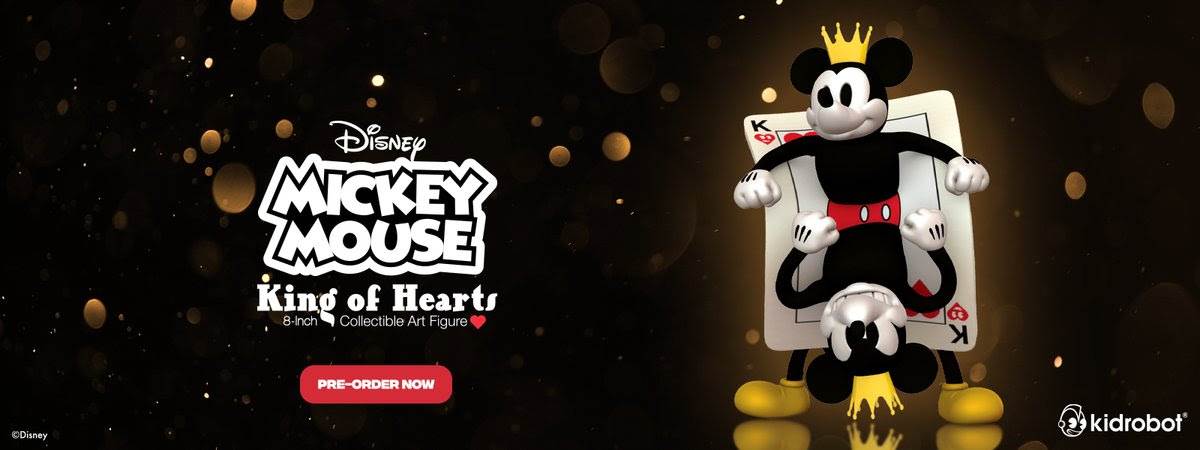 - Mickey “King of Hearts” reimagines the king of “The House the Mouse Built” as the King of Hearts card. Filled with a dynamic duality, the sculpt seems on the edge of coming to life and will add a whimsical touch to any space. 8” tall. Retails for $89.99.