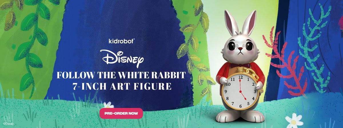 - Alice in Wonderland “White Rabbit” is a wildly cute version of the perpetually tardy character. Wearing tiny spectacles and holding an oversized gold pocket watch, the White Rabbit also has soft-touch flocking on his pristine white fur. 7” tall. Retails for $89.99.