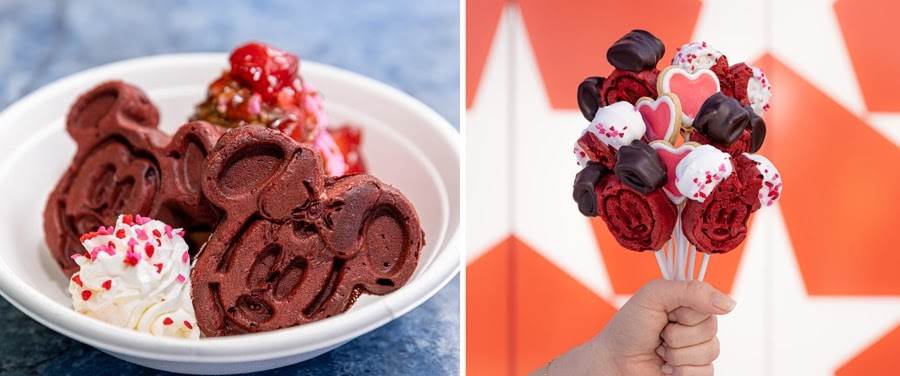- Sweetheart Sundae: Mickey and Minnie red velvet waffle with strawberry and chocolate swirl, hot fudge, strawberry sauce, and whipped cream (available Feb.9 through Feb. 20) (New)