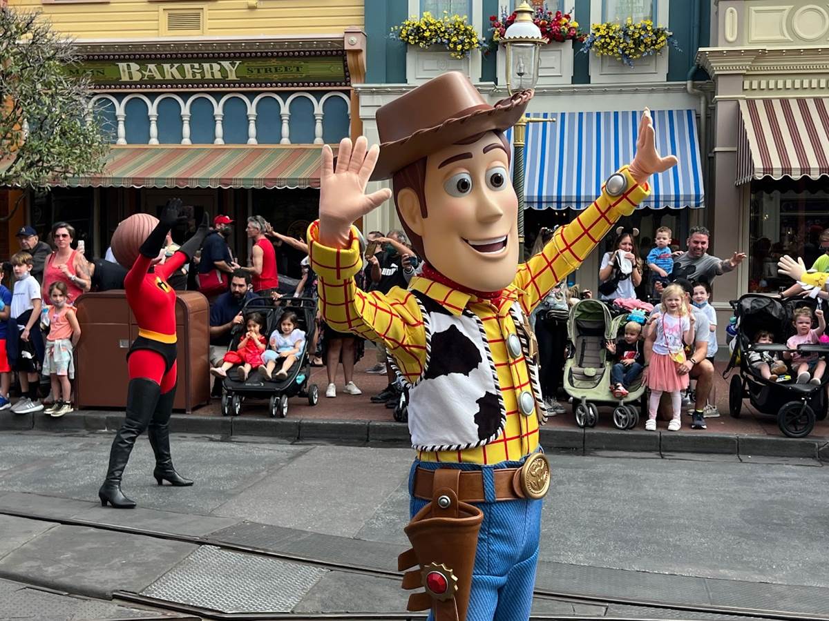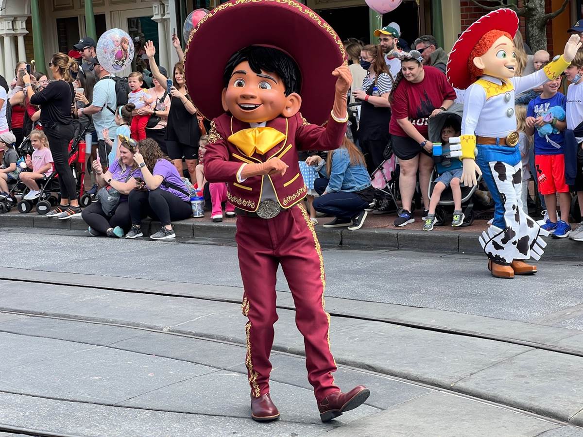 The cavalcade begins with characters including Miguel, Jessie, Woody, and The Incredibles.