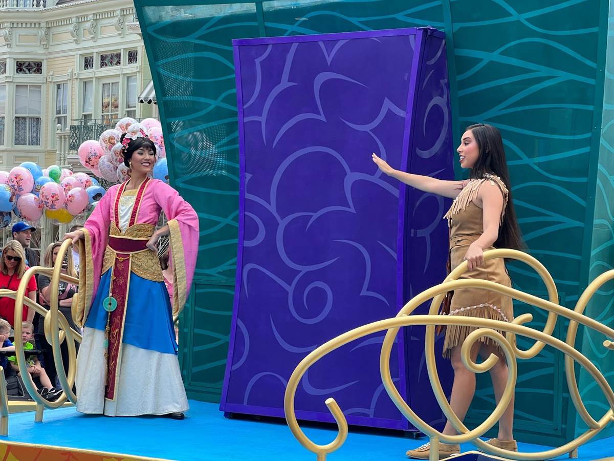 The first float features Princess Elena, Merida, Moana, Pocahontas and Mulan