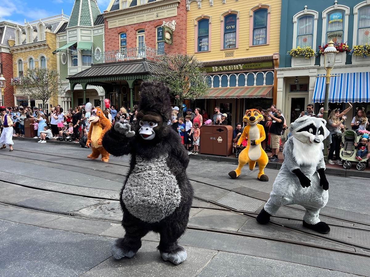 Following the princess float are some of your favorite sidekicks including Turk, Meeko and Timon along with Baloo and King Louie.