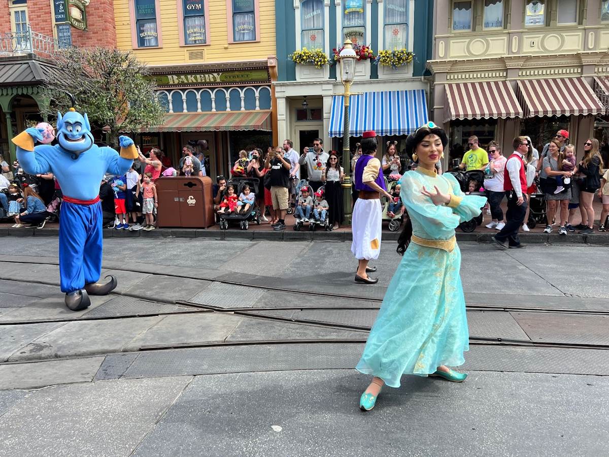 Trailing behind are Aladdin, Jasmine and Genie.