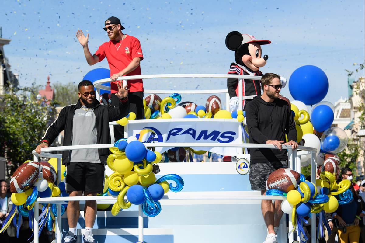 Following their big win in the Super Bowl last night, stars Cooper Kupp, Aaron Donald, and Matt Stafford of the Los Angeles Rams kept with tradition and visited Disneyland today to celebrate. While there, MVP Cooper Kupp posed with some Marvel super heroes in Avengers Campus, and all three participated in a special cavalcade down Main Street U.S.A.