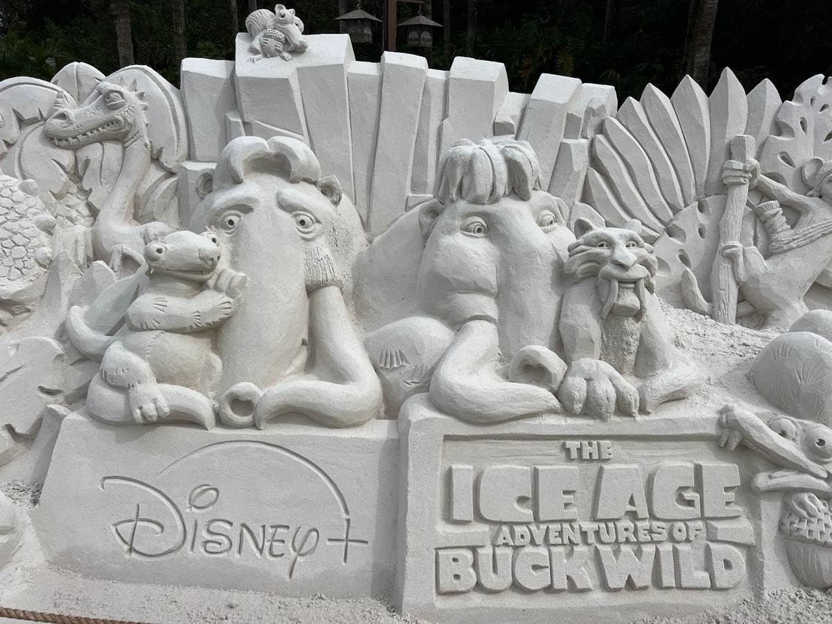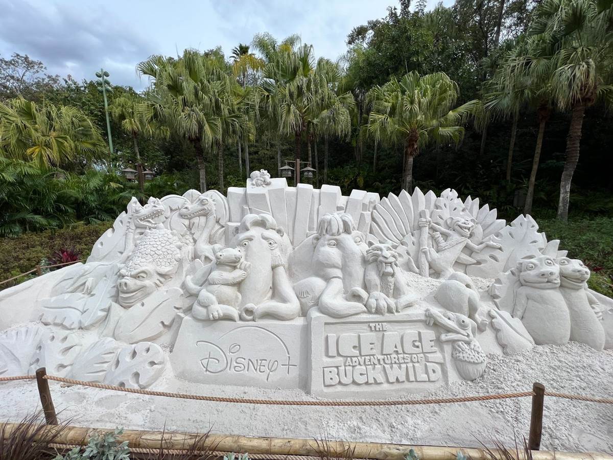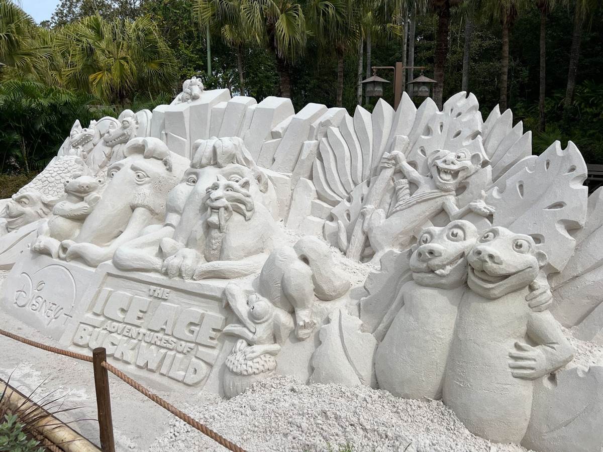 In keeping with a recent tradition at Disney’s Animal Kingdom, a new sand sculpture has been created at the entrance of the park, promoting the debut of the new Disney+ film The Ice Age Adventures of Buck Wild.
