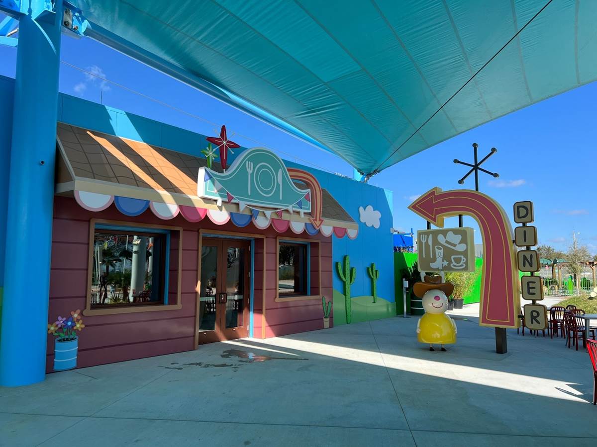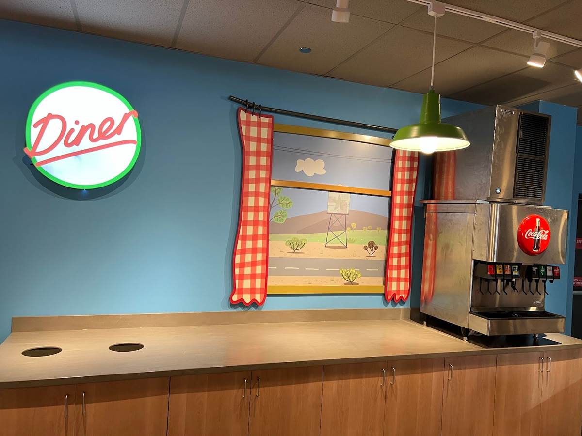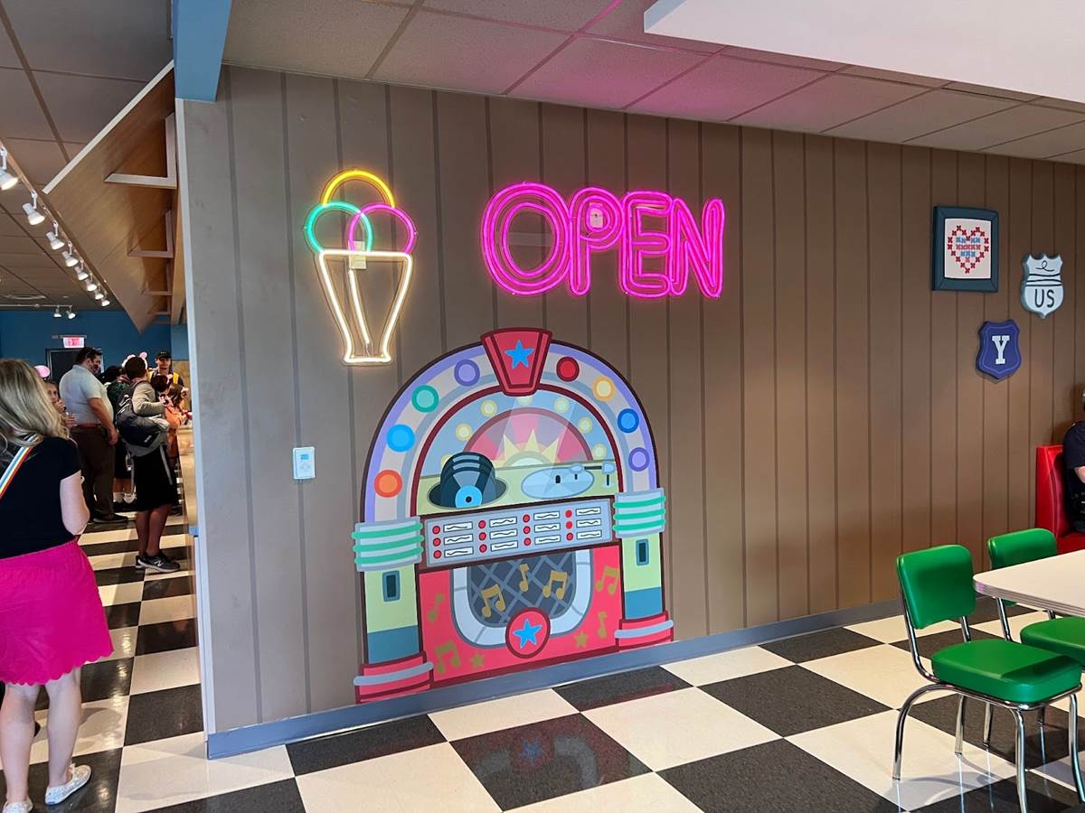 The inside of Miss Rabbit’s Diner is decorated like a classic diner complete with neon signs and a jukebox!