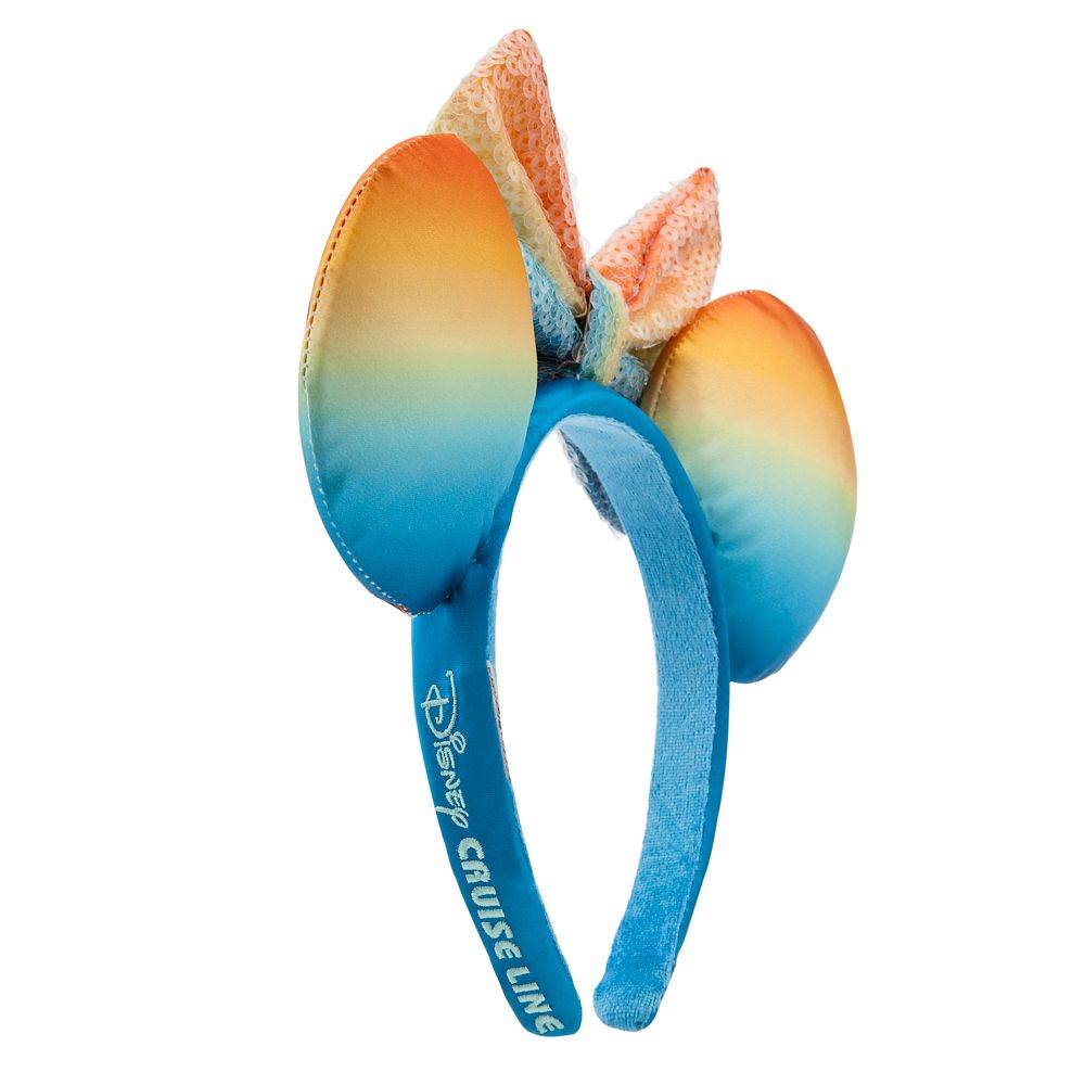 - A sequined bow matches the Ear coloring and adds some lovely dimension to the all blue headband. One side of the headband is embroidered with the words “Disney Cruise Line.”