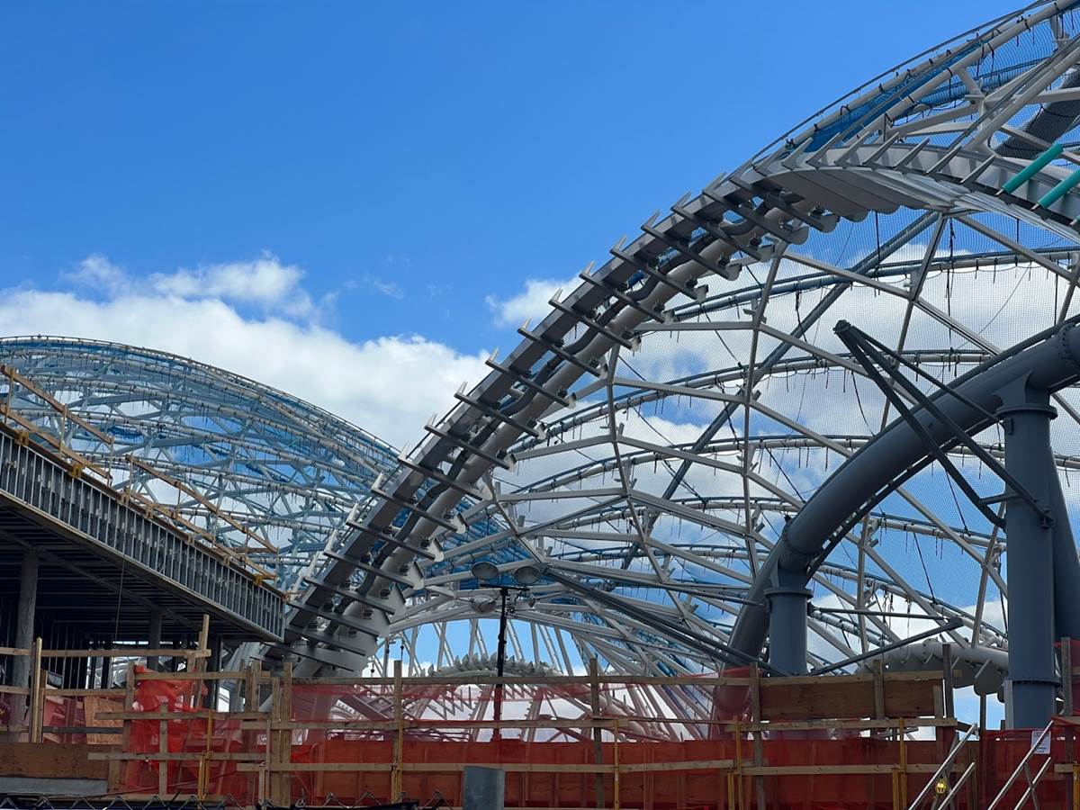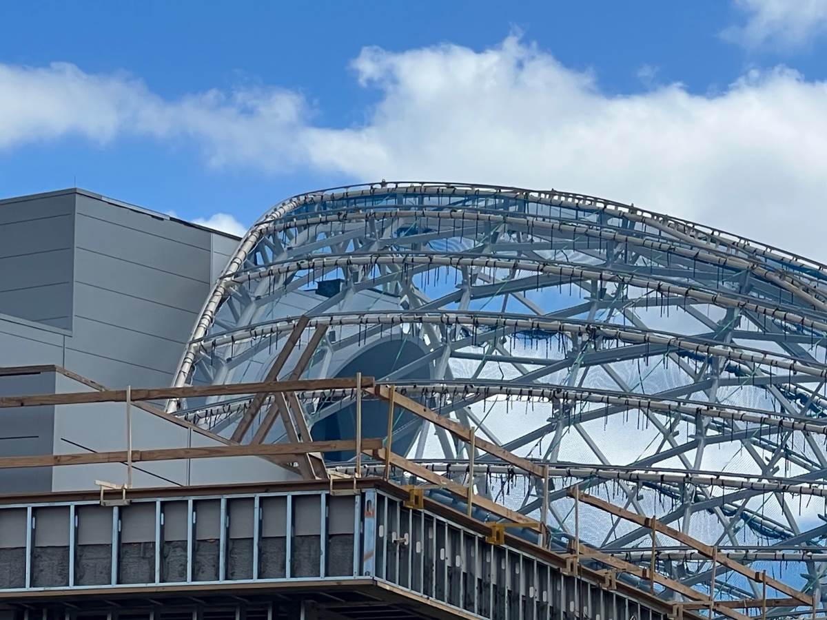 Most exciting is the progress that has finally been made on the canopy of the exterior structure, with installation underway on the permanent structure.